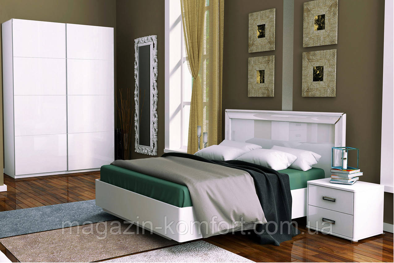 Спальний гарнітур Белла в білому кольорі — чудова новинка фабрики “МироМарк”. Ця спальня виділяється стриманим дизайном і чіткими лініями. Блискучі фасади гарнітура створюють у кімнаті відчуття теплоти та затишку, а білий колір додає трошки світла. Складається з великого ліжка, двох приліжкових тумбочок, комода та місткої шафи, внутрішнє наповнення якого можна зробити за вашим бажанням. Виголов'я ліжка оформлене досить просто, але завдяки використанню м'якої білосніжної обшивки має досить ефектний та ошатний вигляд. Зручний комод обладнаний трьома шухлядами. Фасади шафи, комода та приліжкових тумбочок прикрашені функціональними ручками. Такий спальний гарнітур ідеально підійде для спальні в стилі мінімалізму або хай тек.