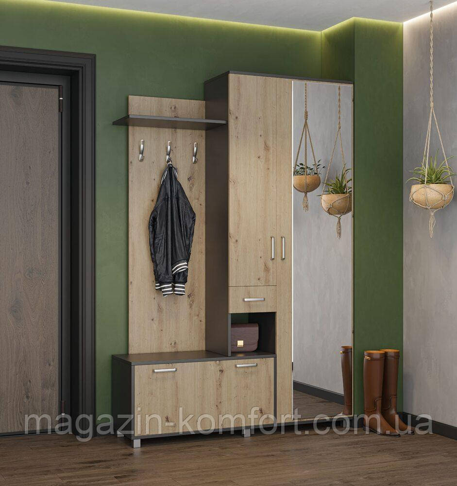 Модель складається з таких елементів, як платтяне відділення з дзеркальним фасадом, містка тумба, відкрита полиця, висувна скринька, просторе відділення за двостулковими дверцятами та гачки для верхнього одягу. Передпокій «Реприза» буде ідеальним варіантом для облаштування просторих передпокоїв.